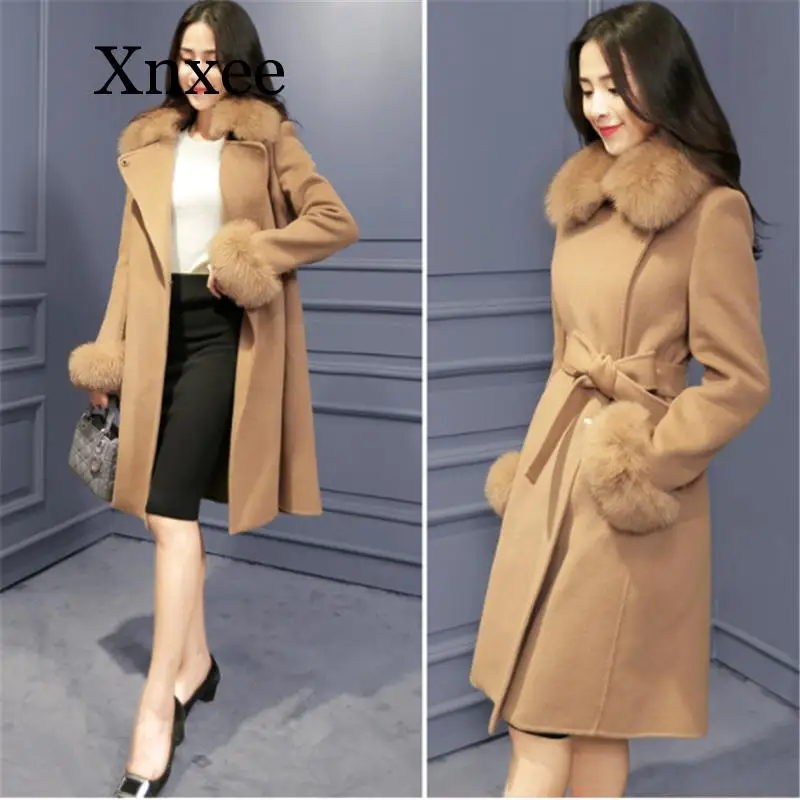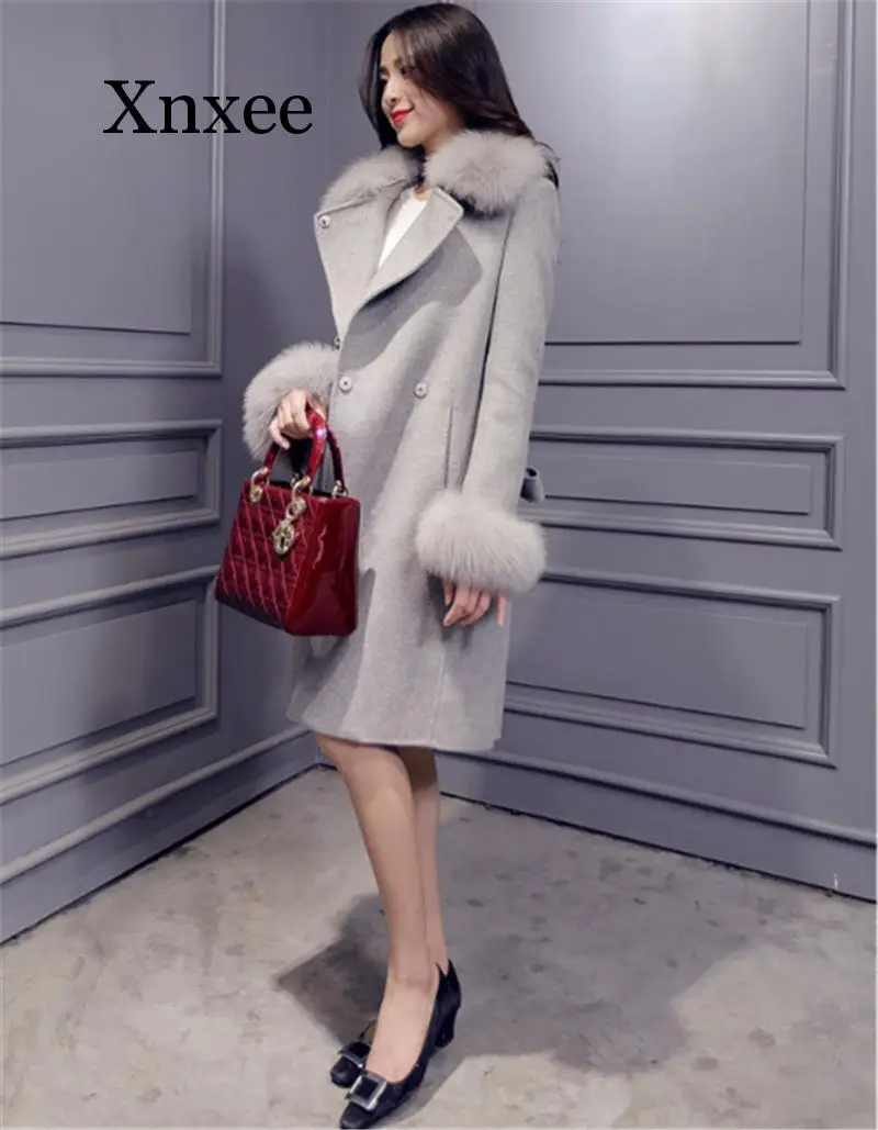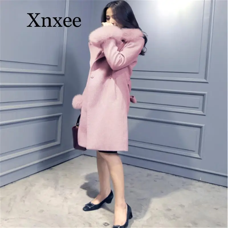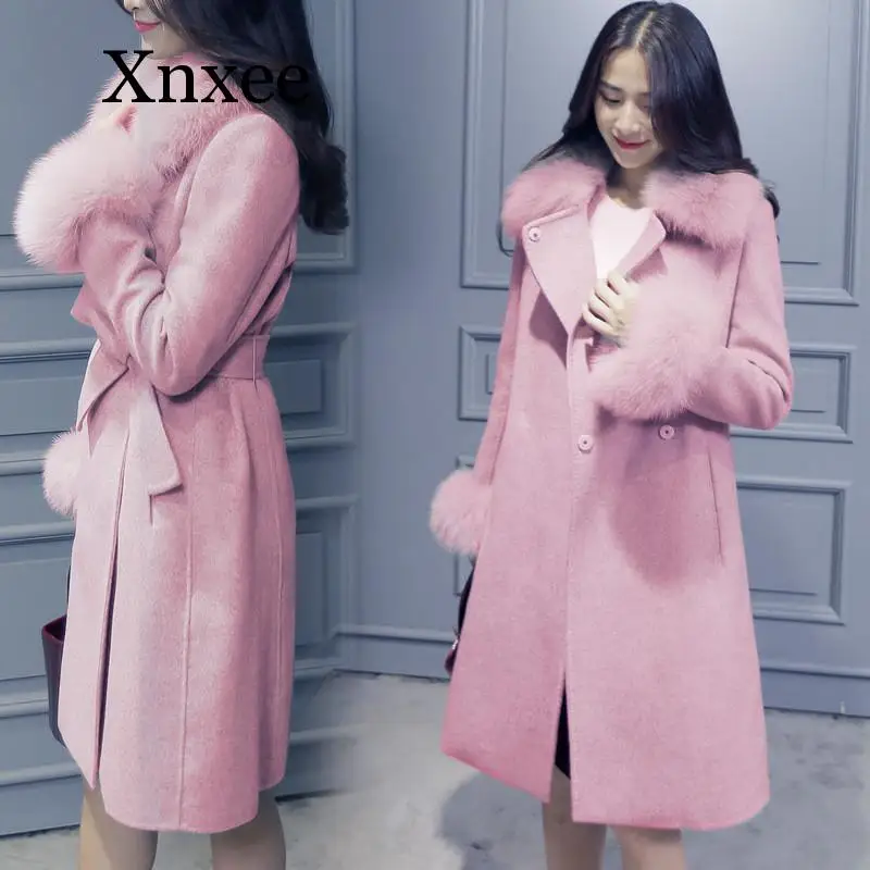 Winter Pink Elegant Jacket Ladies Elegant Gray Cashmere Jacket Belt Wool Jacket Cute Office Long Coat Fur Collar.